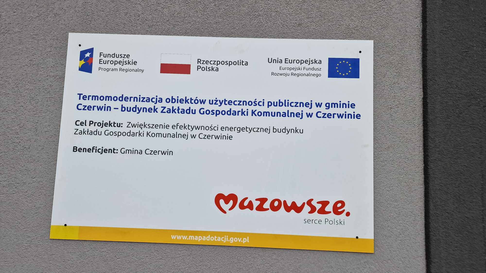 Gmina Czerwin na podstawie umowy o dofinansowanie nr RPMA.04.02.00-14-i332/20-00 z dnia 10 listopad 2021 r. realizuję projekt pn. „Termomodernizacja obiektów użyteczności publicznej w gminie Czerwin – budynek Zakładu Gospodarki Komunalnej w Czerwinie”.