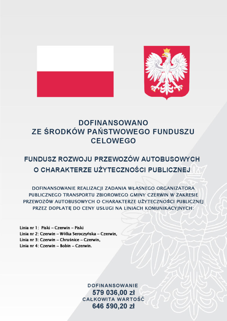 Gmina Czerwin na rok 2025 pozyskała dofinansowanie z Funduszu Rozwoju Przewozów Autobusowych Województwa Mazowieckiego, co zapewni rozwój transportu gminnego. W ramach tego dofinansowania uruchomione zostały cztery linie komunikacyjne, które będą kursować nie tylko w dni robocze, ale również w soboty, niedziele i święta. Dzięki temu mieszkańcy gminy zyskają lepszy dostęp do transportu publicznego, co pozytywnie wpłynie na mobilność i codzienne życie.