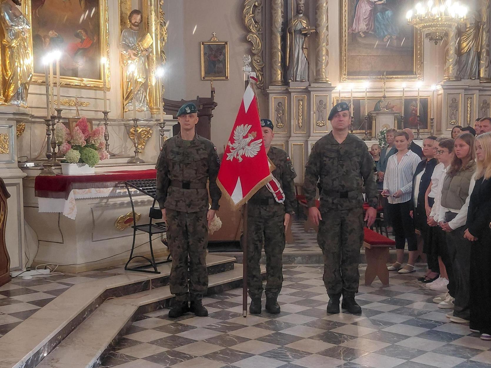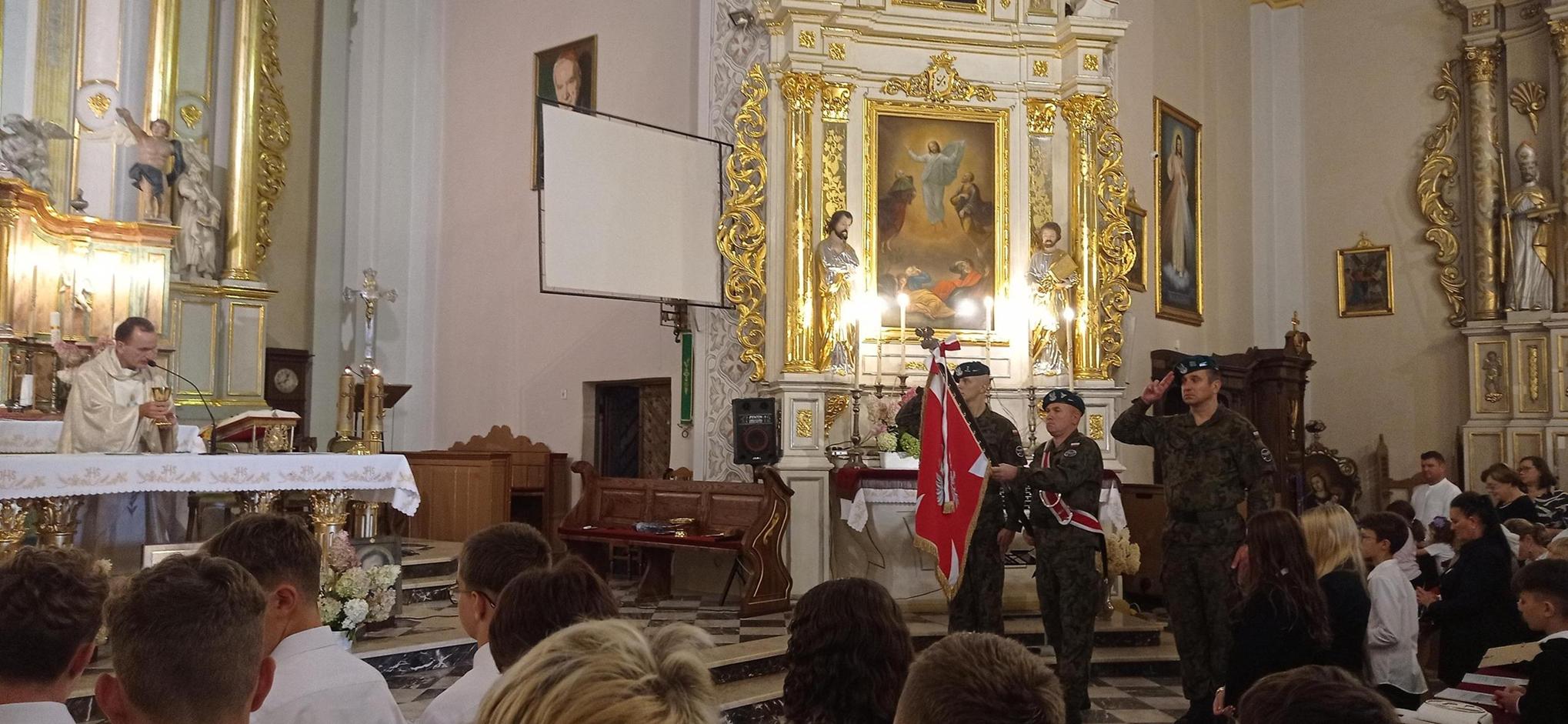 Mszę św. w kościele parafialnym p.w. Trójcy Przenajświętszej w Czerwinie celebrował ks. wikary Andrzej Gołaszewski, który dokonał uroczystego wprowadzenia Chorągwi Wojska Polskiego. Podczas wprowadzania trębacz grał utwór „Błękitne rozwińmy sztandary”. Następnie ksiądz Andrzej przywitał gości i wszystkich obecnych na uroczystości, a także Poczty Sztandarowe.