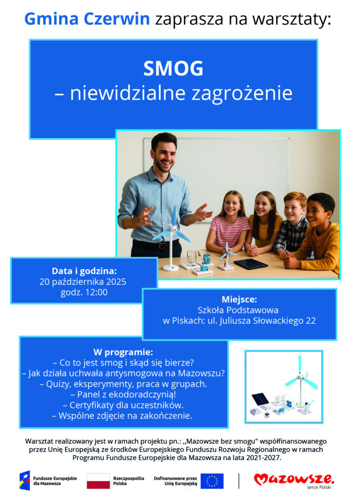 Gmina Czerwin serdecznie zaprasza uczniów na wyjątkowe warsztaty edukacyjne poświęcone problemowi smogu i ochronie powietrza.