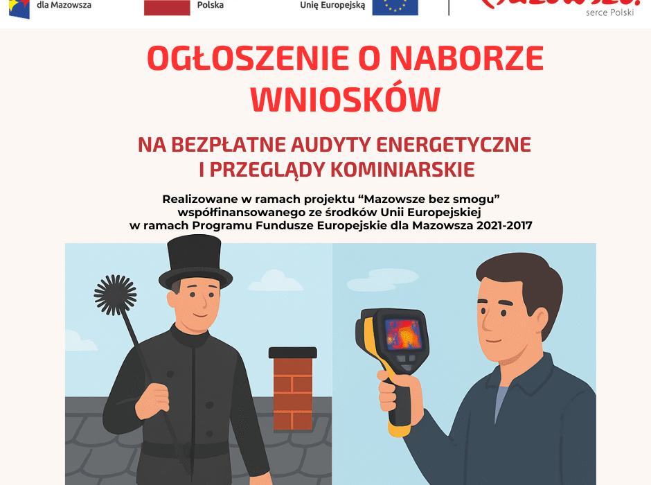 Gmina Czerwin ogłasza nabór wniosków na bezpłatne audyty energetyczne i przeglądy kominiarskie na terenie Gminy w ramach realizacji projektu „Mazowsze bez smogu” współfinansowanego ze środków Unii Europejskiej w ramach Programu Fundusze Europejskie dla Mazowsza na lata 2021–2027. Nabór wniosków będzie prowadzony od 20 października 2025 r. do 31 października 2025...