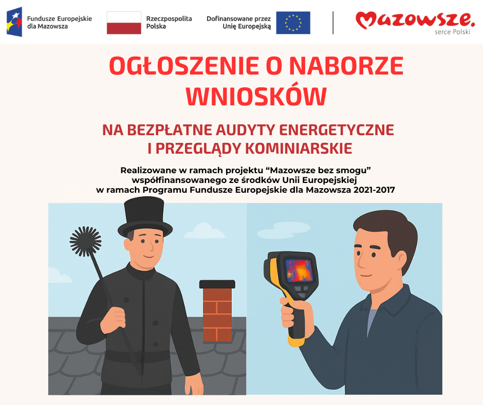 Gmina Czerwin ogłasza nabór wniosków na bezpłatne audyty energetyczne i przeglądy kominiarskie na terenie Gminy w ramach realizacji projektu „Mazowsze bez smogu” współfinansowanego ze środków Unii Europejskiej w ramach Programu Fundusze Europejskie dla Mazowsza na lata 2021–2027.