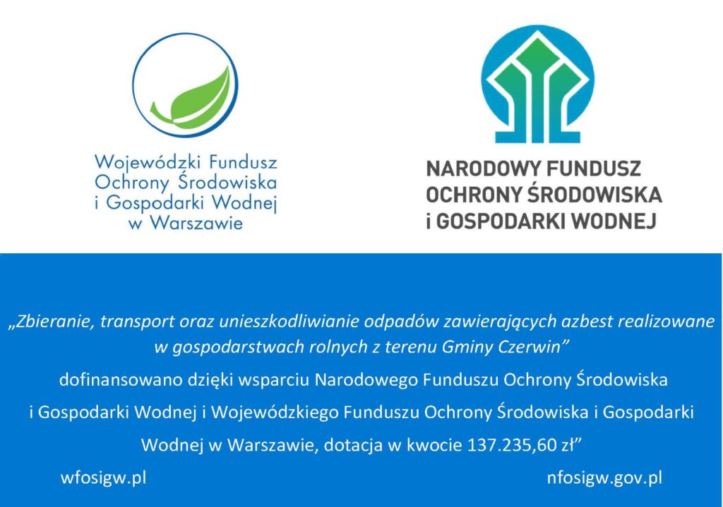 Informujemy, iż 18.11.2025 r. została podpisana Umowa Dotacji na dofinansowanie realizacji zadania pn. „Zbieranie, transport oraz unieszkodliwianie odpadów zawierających azbest realizowane w gospodarstwach rolnych z terenu Gminy Czerwin”. Dotacja dotyczy rolników, którzy otrzymali dofinansowanie z Agencji Restrukturyzacji i Modernizacji Rolnictwa oraz przedstawili dokument potwierdzający rozliczenie ww. programu.