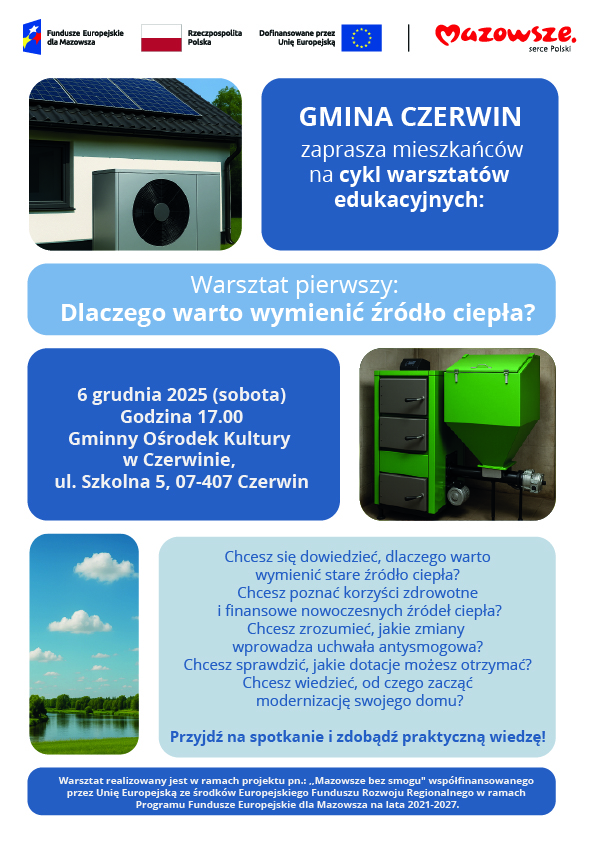 Gmina Czerwin serdecznie zaprasza mieszkańców na pierwszy z cyklu warsztatów edukacyjnych poświęconych poprawie jakości powietrza oraz możliwościom modernizacji domowych systemów grzewczych. Spotkanie odbędzie się 6 grudnia 2025 r. (sobota) o godz. 17.00 w Gminnym Ośrodku Kultury w Czerwinie (ul. Szkolna 5).