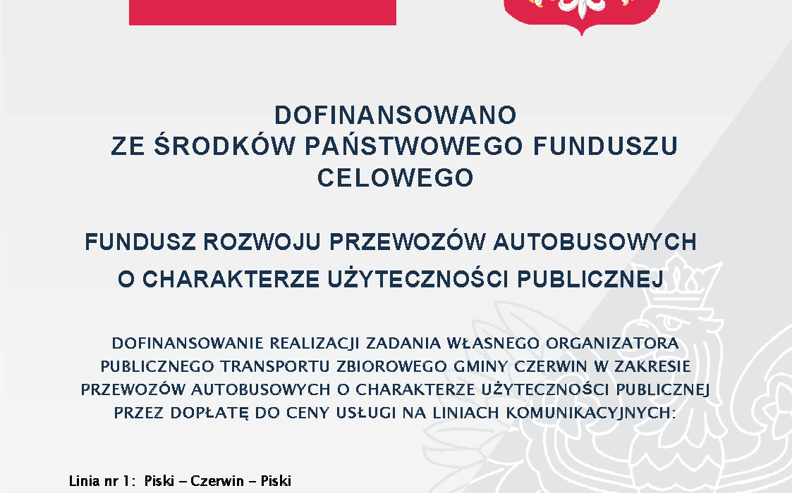 Gmina Czerwin konsekwentnie inwestuje w rozwój transportu publicznego. W 2026 roku, dzięki dofinansowaniu z Funduszu Rozwoju Przewozów Autobusowych Województwa Mazowieckiego, uruchomione zostały cztery linie komunikacyjne. Umowa dofinansowania dla Gminy Czerwin zawarta została dnia 22 grudnia 2025 r. Autobusy kursować będą nie tylko w dni robocze, ale również w soboty, niedziele...